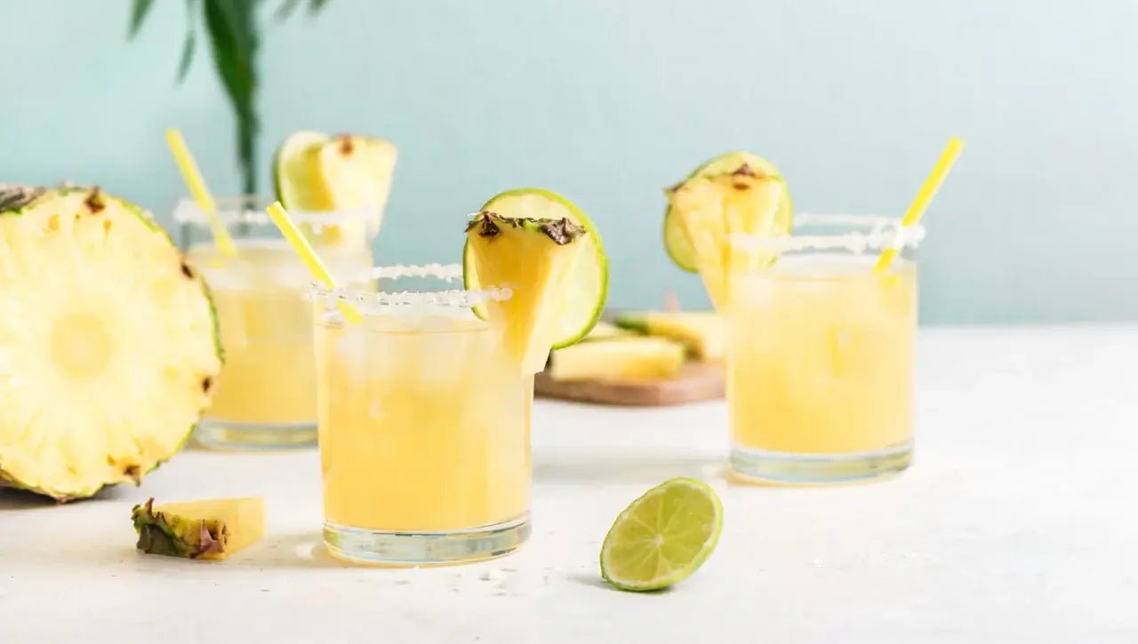 Serve with a salted rim, if desired. You can add a few pinches of chili powder to the salt for a kick of flavour. Garnish with a pineapple wedge and lime wheel.