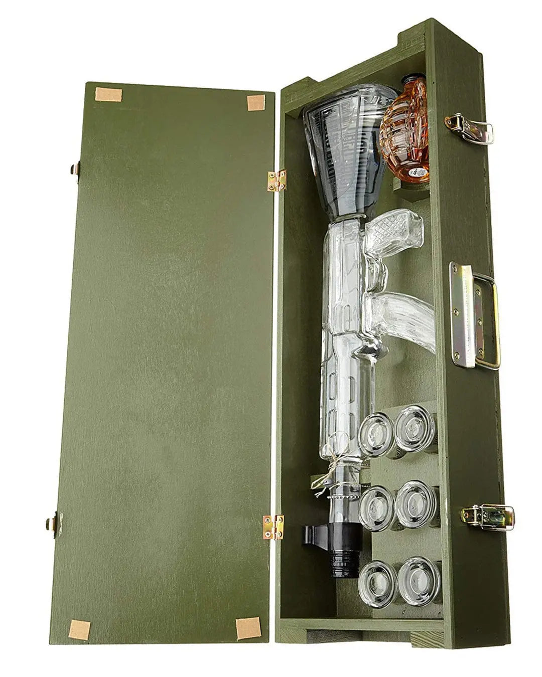 This extraordinary product bundle combines two of Russia's biggest exports: The vodka and the Kalashnikov. Kalaschnikow Red Army Vodka comes packed in a green wooden ammunition box and in shape of a glass replica of the legendary Russian assault rifle (also known as AK-47) which is filled with 1 l of high quality vodka made of finest spirit and crystal clear spring water. The vodka is very smooth with subtle notes of honey and vanilla.In addition, the box includes a hand-grenade shaped flask filled with fine herbal liqueur and six shot glasses with "Red Army" emblems!